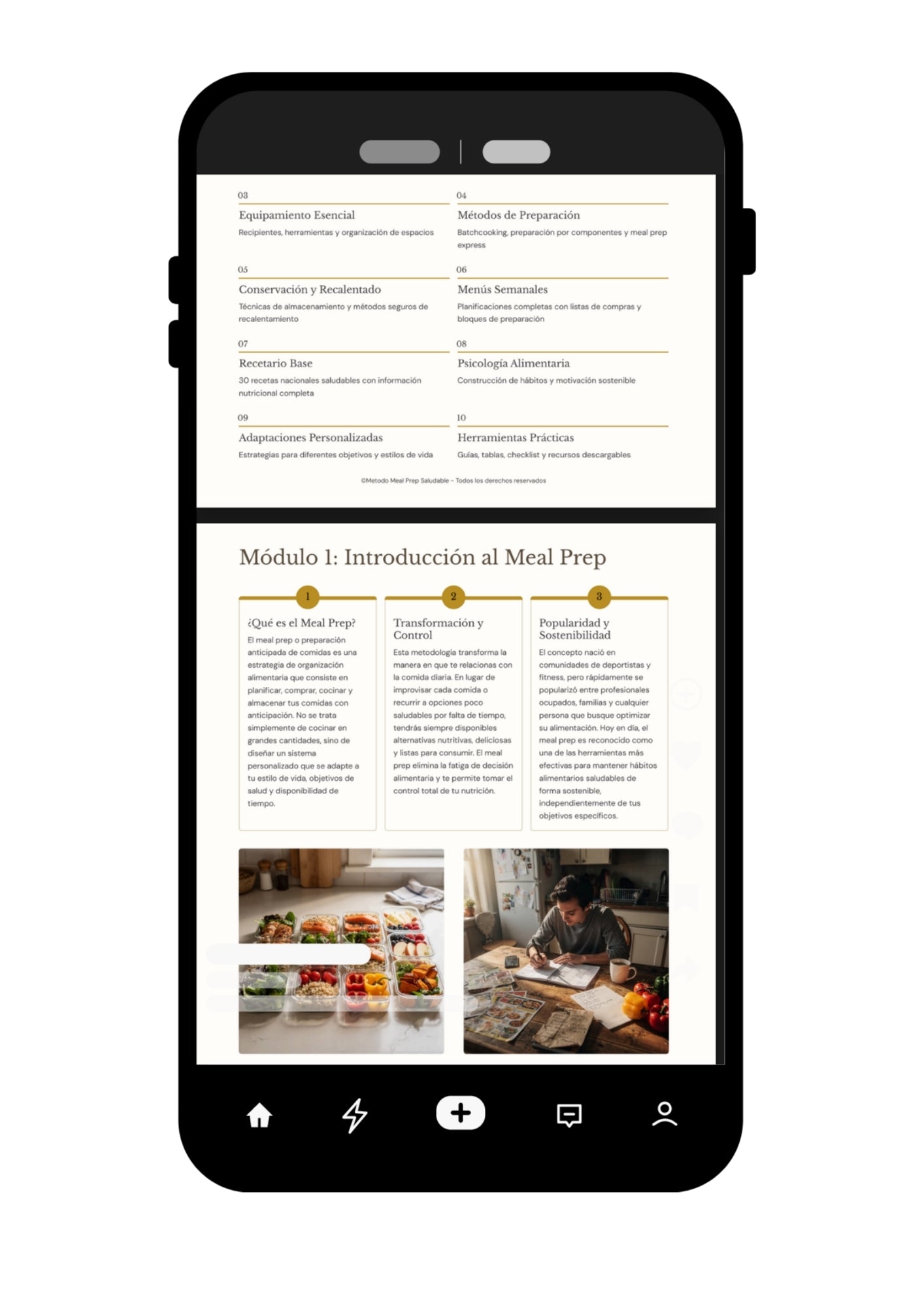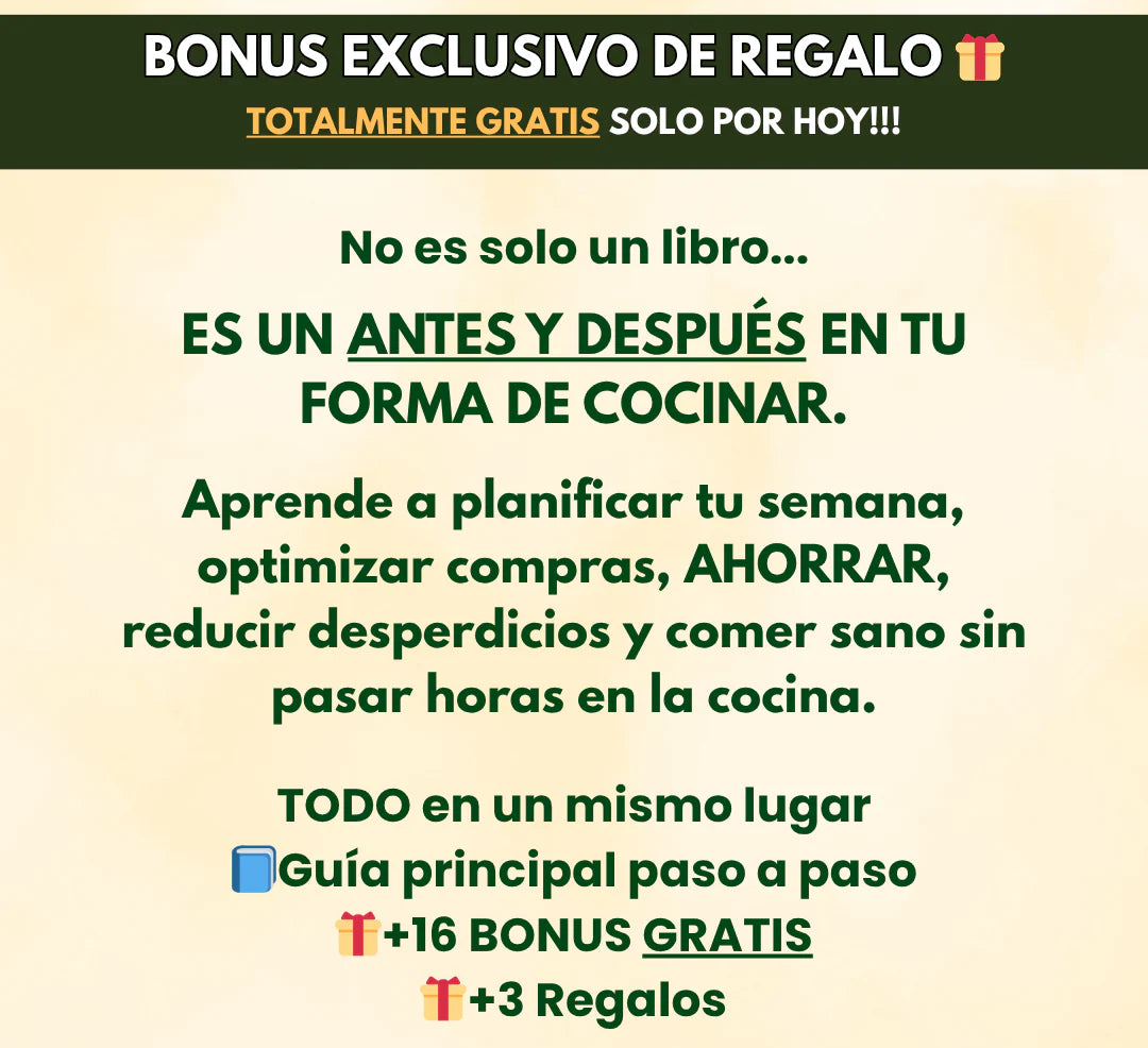Incluye el método paso a paso, plantillas de organización, guías de conservación, ejemplos de menús, y bonos exclusivos con recetas y estrategias de ahorro.